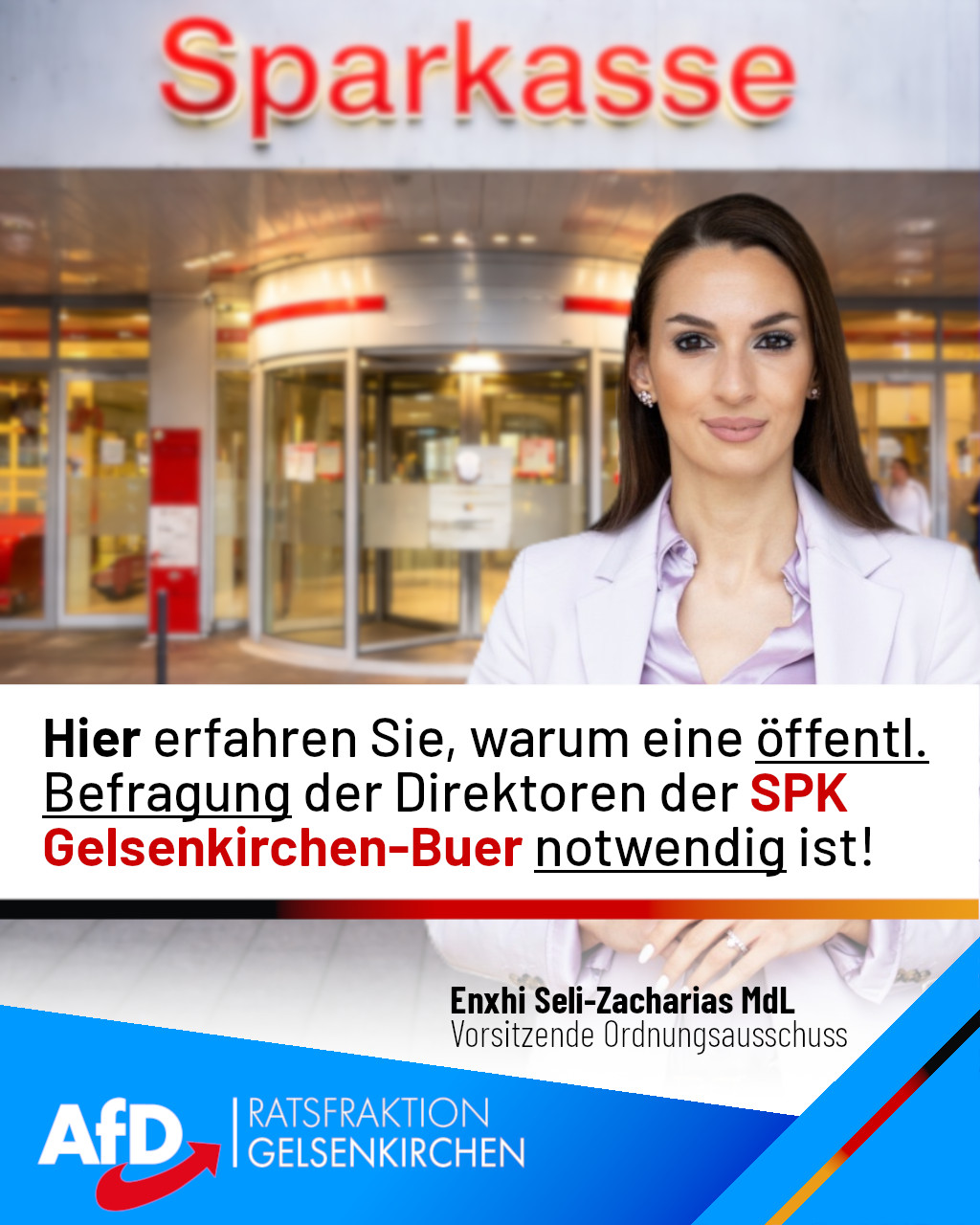 Aus aktuellem Anlass beantragt die AfD-Ratsfraktion, zur nächsten Sitzung des Ordnungsausschusses die Verantwortlichen der Sparkasse Gelsenkirchen-Buer sowie den Polizeipräsidenten zu laden. Da …