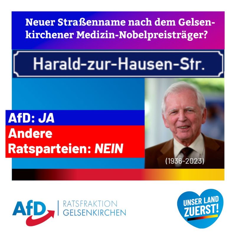 Der Antrag der AfD-Fraktion Gelsenkirchen vom 25. Juli, eine örtliche Straße oder einen Platz nach dem Krebsforscher und Medizin-Nobelpreisträger Prof. Harald zur …